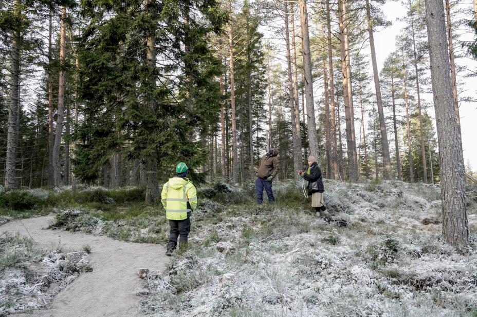 Oslo-ordfører Anne Lindboe og Lord Mayor of Westminster, Paul Dimoldenberg skal sammen felle årets julegran til London. Årets tre blir felt i nærheten av Ullevålseter sportsstue. Fellingen ble forsinket av aktivister fra Extinction Rebellion. Foto: Jonas Fæste Laksekjøn / NTB