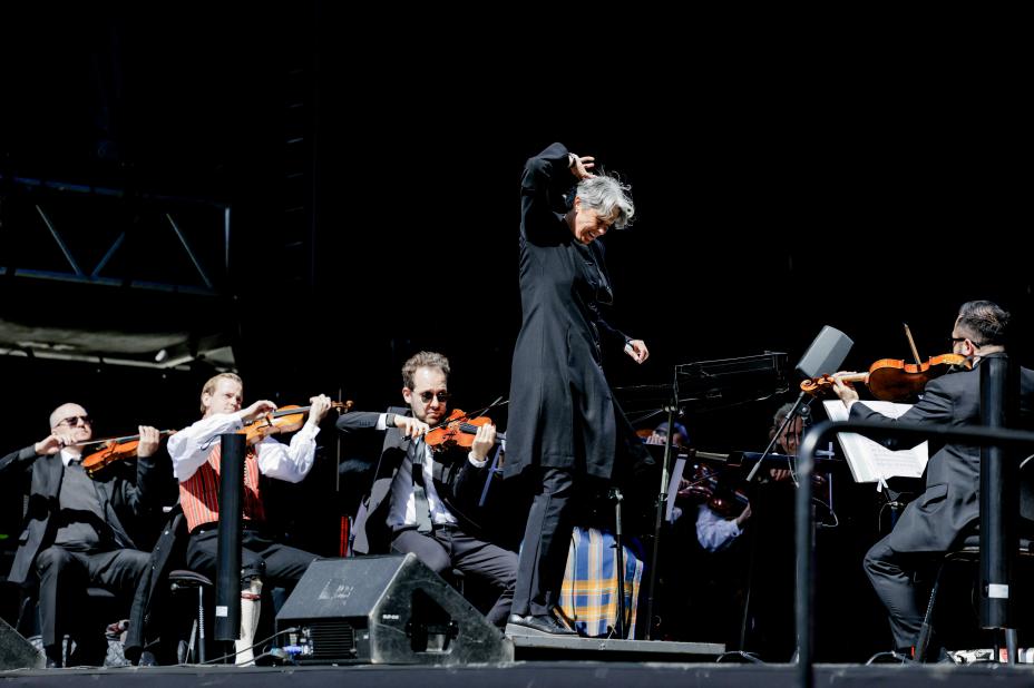 Dirigent Grete Pedersen og Bergen Filharmoniske Orkester under festspillenes åpningsseremoni på Torgallmenningen i mai i år. Foto: Paul S. Amundsen / NTB