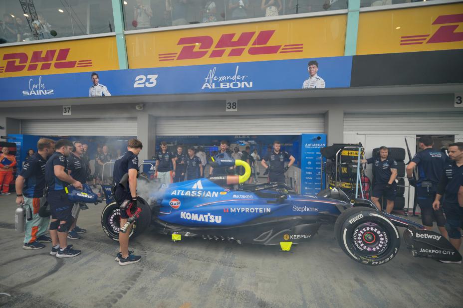 Sport: Treningen var knapt i gang da det veltet ut røyk ved det ene hjulet til Williams-fører Albon.