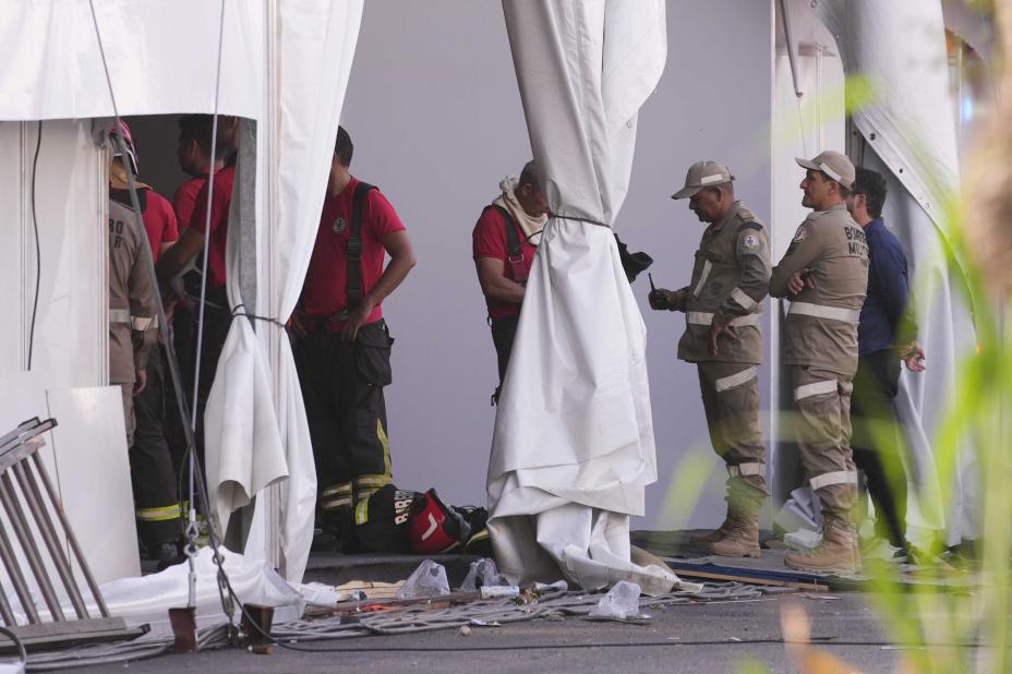Brannvesen og redningsmannskaper ved konferansestedet der det brøt ut brann i Belém i Brasil torsdag. Foto: Andre Penner / AP / NTB