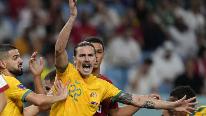 Jackson Irvine i aksjon for Australia i en VM-kamp mot Danmark i 2022. Foto: Aijaz Rahi / AP / NTB