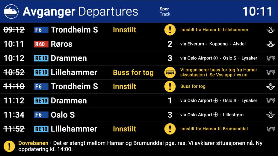 Økonomi og næringsliv: – Vi avklarer situasjonen nå. Ny avklaring klokken 14, sto det i en trafikkmelding på flere skjermer på Hamar stasjon onsdag formiddag.