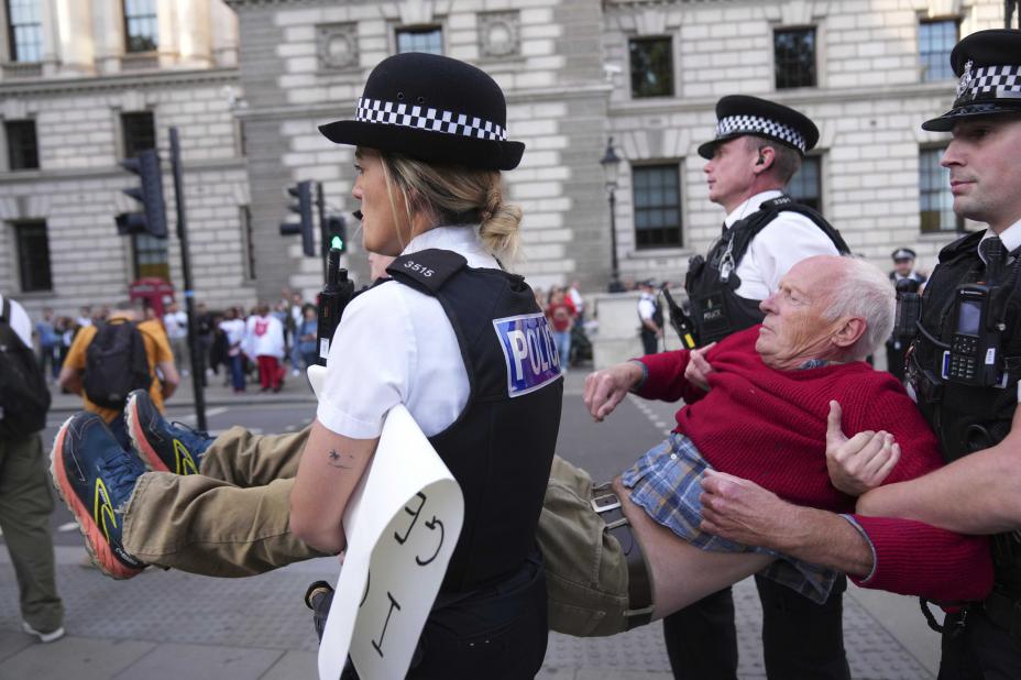 Britisk politi bærer bort en mann fra en demonstrasjon til støtte for Palestine Action i september. Foto: Joanna Chan / AP / NTB
