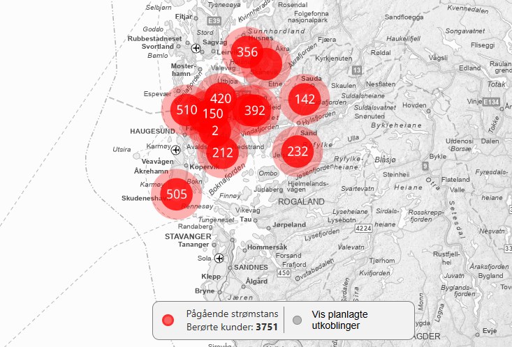 Nærmere 4.000 strømkunder på Haugalandet var uten strøm under uværet. Over 12.000 kunder var berørt av strømbrudd i Vestland, blant annet i Sunnhordland.