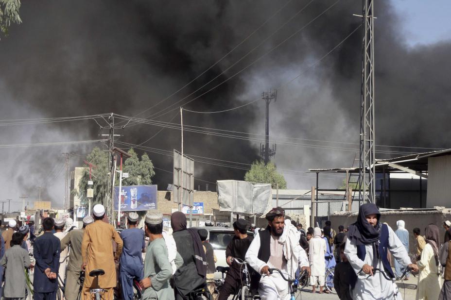 Røyk stiger opp i lufta under kamper mellom Taliban og afghanske regjeringsstyrker i Kandahar i august 2021. FNs menneskerettighetsråd (UNHCR) har besluttet å åpne granskning av mulige menneskerettsbrudd i krigen i landet. Foto: Sidiqullah Khan / AP / NTB