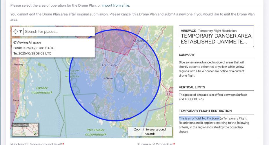 – Det betyr at det er ikke forbudt å fly i området for verken dronepiloter eller kommersielle flyginger, men at man må være bevisst på at man befinner seg i et etablert fareområde, skriver kommunikasjonsrådgiver Helene Wattanapradit Jensen.