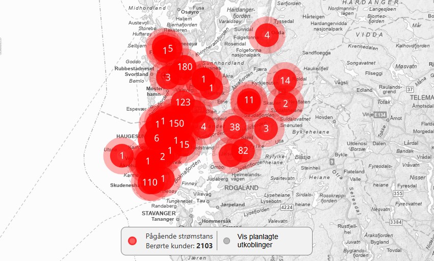 Det er fortsatt store problemer med strømbrudd på hele Haugalandet. 2103 strømkunder var fortsatt rammet ved 18.45-tiden lørdag kveld.