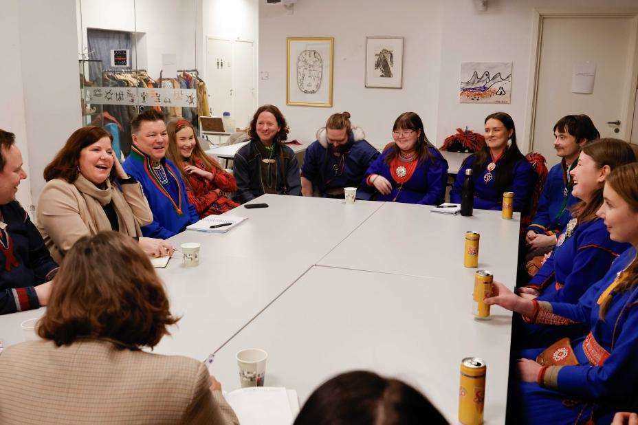 FNs ekspertmekanisme for urfolks rettigheter (EMRIP) møtte de tiltalte Fosen-aksjonistene onsdag. Delegasjonens mandat er å gi råd til medlemslandene om hvordan de kan følge opp FNs erklæring om urfolks rettigheter. Foto: Rasmus Berg / Natur og Ungdom / Handout / NTB