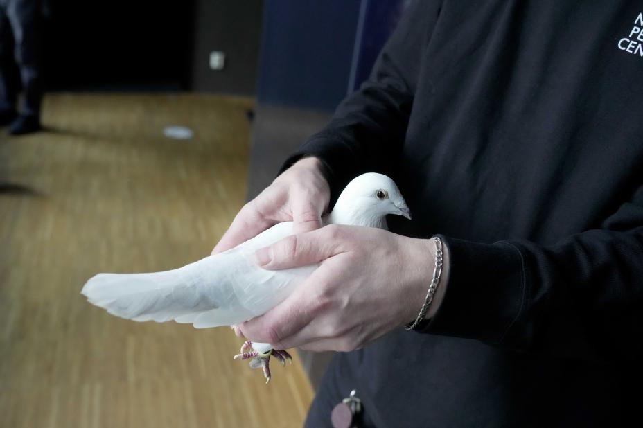 En fredsdue ble klokka 12 sluppet ut av vinduet i Nobels Fredssenter for å markere at venezuelanske Maria Corina Machado er tildelt fredsprisen.