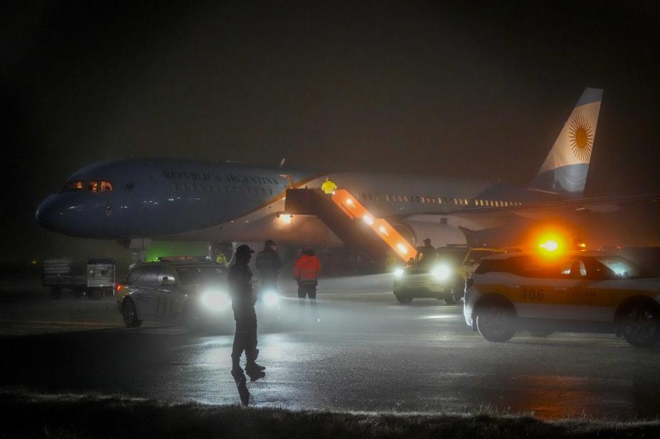 Flyet med Argentinas president Javier Milei på Oslo lufthavn Gardermoen tirsdag kveld. Foreløpig tyder alt på at selve fredsprisvinneren Maria Corina Machado ennå ikke har satt sine bein på norsk jord. Foto: Gorm Kallestad / NTB