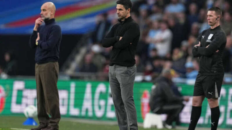 Pep Guardiola (t.v.) og Mikel Arteta avbildet under ligacupfinalen. Foto: Maja Smiejkowska / AP / NTB