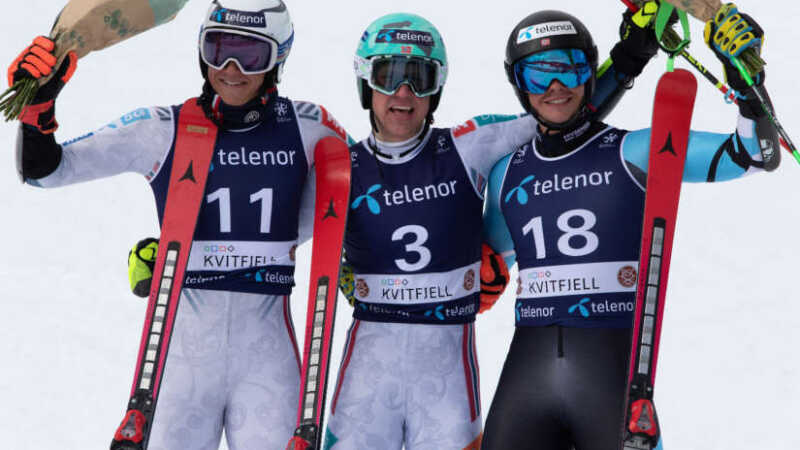 Rasmus Bakkevig (i midten) vant NM i storslalåm på Kvitfjell. Jarand Husby Haugen (t.v.) kom på sølvplass, og Tollef Haugen tok bronsen. Foto: Claes-Tommy Herland / Norges Skiforbund / Handout / NTB