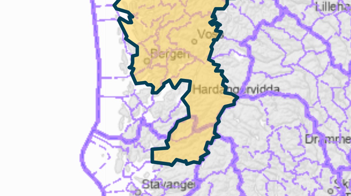 Farevarselet gjelder i områder fra 0 til 1000 meter over havet. Varslingsområdet er oppdatert og utvidet til også å omfatte Ullensvang, Sauda og Suldal.