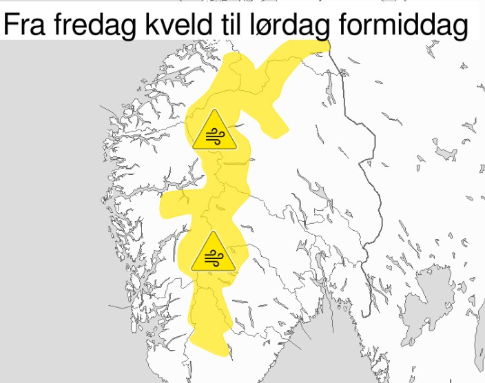 Innbyggerne bes sikre løse gjenstander og unngå unødig ferdsel i fjellet mens uværet står på. Vinden ventes å avta utover lørdag ettermiddag.
