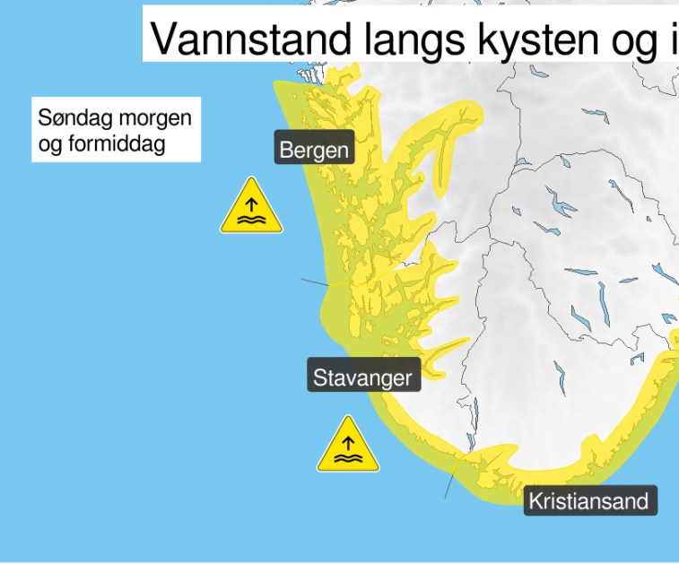 Meteorologene har sendt ut gult farevarsel om høy vannstand søndag formiddag. Årsaken er ekstremværet «Amy» kombinert med tidevann.