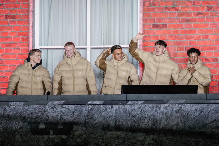 Erling Braut Haaland og de andre Norge-heltene kom ut på Rådhusbalkongen til øredøvende jubel fra mange tusen frammøtte i Oslo.