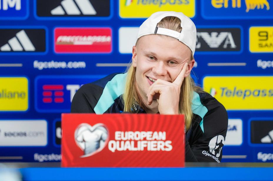 Erling Braut Haaland under en pressekonferanse med Norges herrelandslag i fotball på San Siro før VM-kvalifiseringskampen mot Italia. Foto: Fredrik Varfjell / NTB