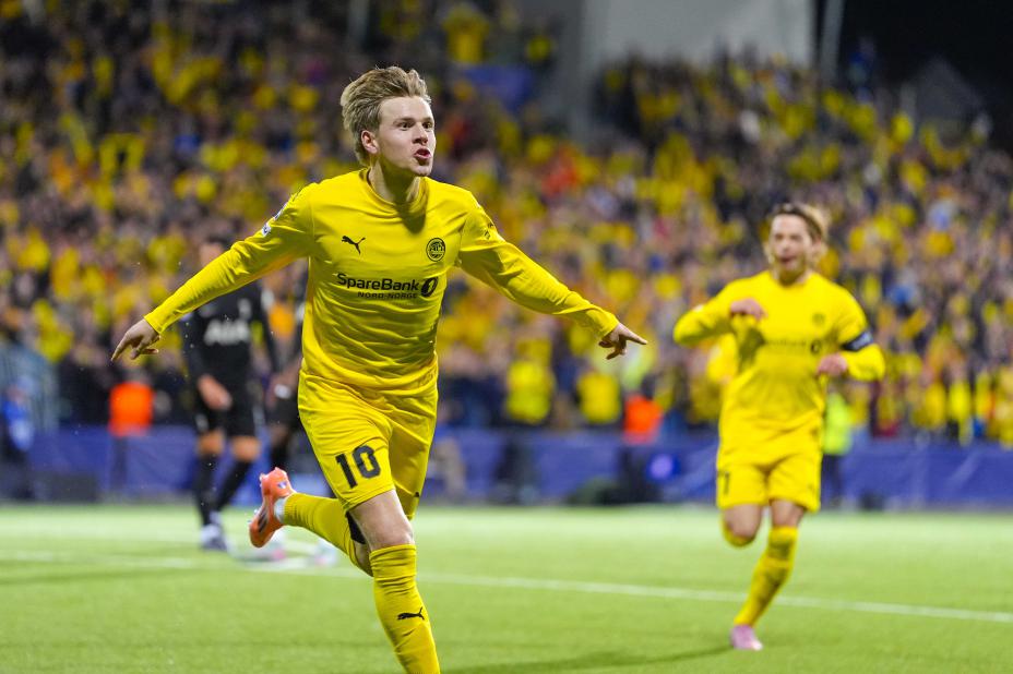 I det 53. minutt håndterte Odin Bjørtuft det høye Tottenham-presset med en ypperlig pasning gjennom flere ledd til Håkon Evjen, som i sin tur fant Hauge ute til venstre. Han vendte innover, fintet vekk Porro og curlet ballen i lengste hjørne før han jublet for den aller første CL-scoringen så langt nord.