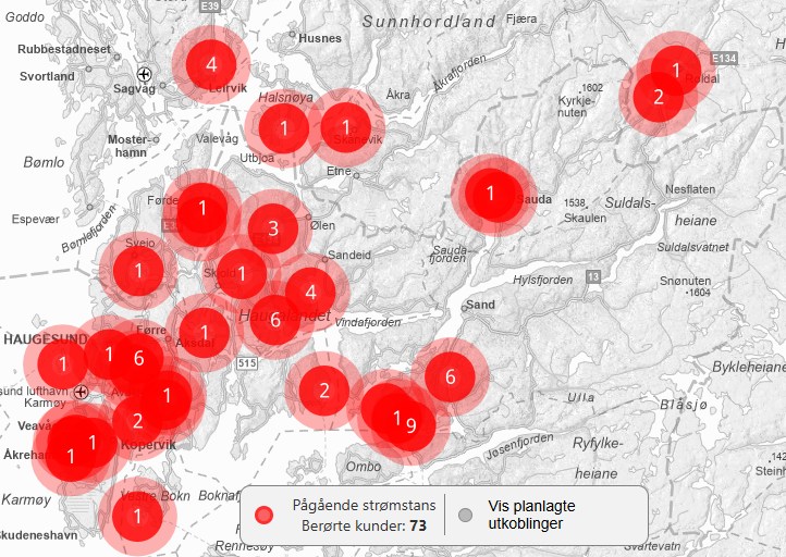73 kunder på Haugalandet var søndag kveld fremdeles var uten strøm etter uværet. 420 kunder i Vestland fremdeles var uten strøm.