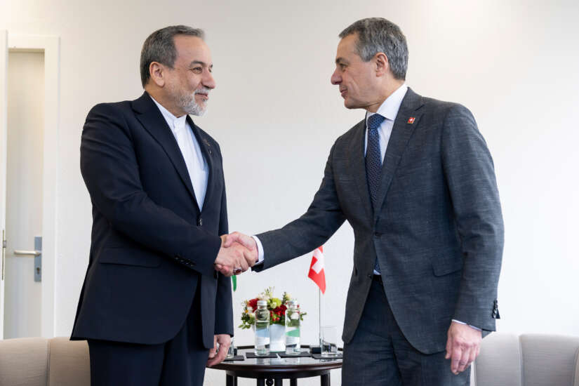 Irans utenriksminister Abbas Araghchi og Sveits' utenriksminister Ignazio Cassis fotografert i Genève tidligere i februar. Foto: Cyril Zingaro / Keystone via AP / NTB