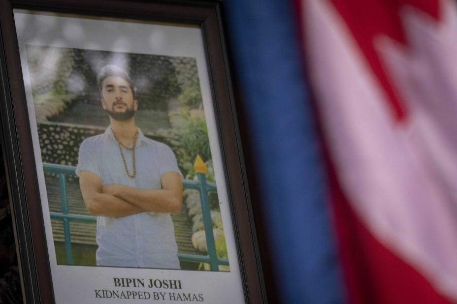 Studenten Bipin Joshi var blant dem som ble tatt som gissel av Hamas. Portrettet hans ble stilt ut ved den israelske ambassaden i Katmandu i fjor, da familien ba om at han og de andre gislene ble løslatt. Foto: Niranjan Shrestha / AP / NTB