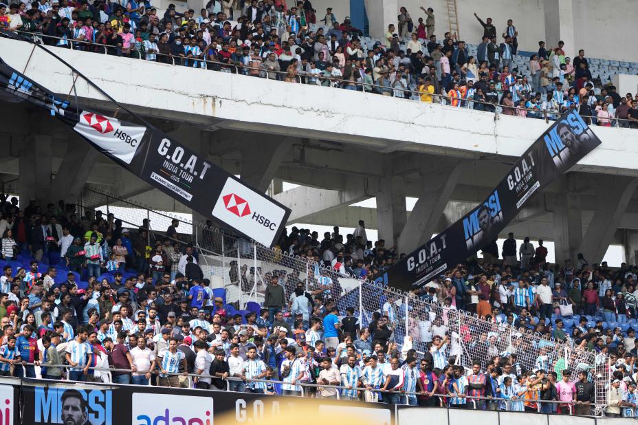 Tilskuere rev ned plakater og kastet stoler da superstjernen Lionel Messi gjorde en skuffende visitt i Kolkata. Foto: Bikas Das / AP / NTB