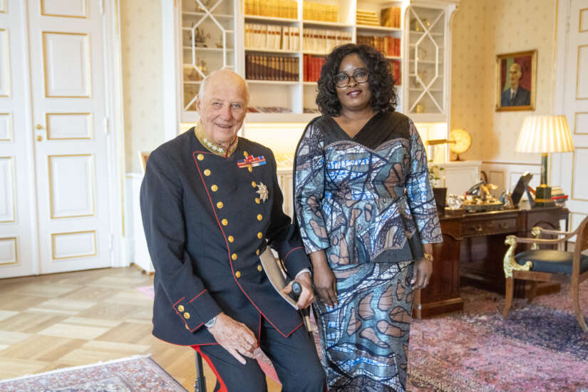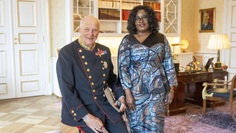 Kong Harald mottok Kongos nye ambassadør, Nana Rosine Aurélie Ngangoue Ivouba, i høytidelig audiens på Slottet torsdag. Foto: Heiko Junge / NTB