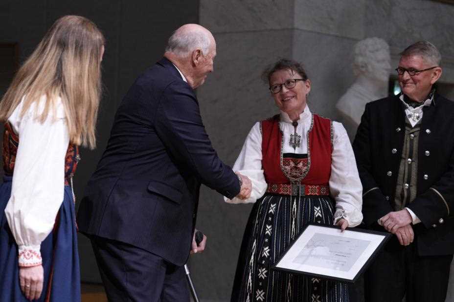 Professor Åslaug Helland (53) fikk Kong Olavs Vs Kreftforeningspris 2023. Prisen ble utdelt i Universitetets aula av Kong Harald.