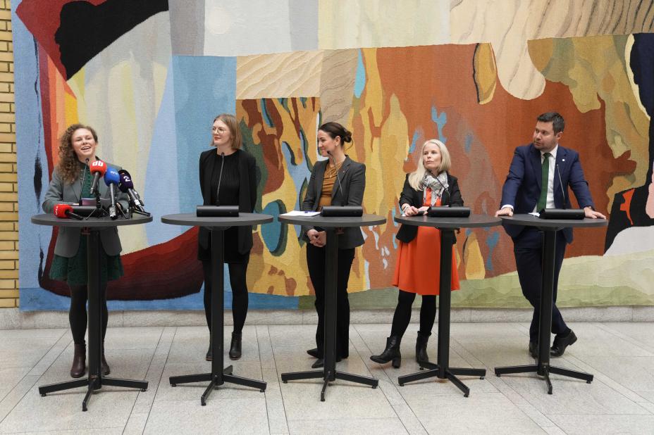 Pressekonferanse om budsjettenigheten natt til onsdag. Fra venstre: Ingrid Liland i MDG, partileder Marie Sneve Martinussen i Rødt, Aps parlamentariske leder Tonje Brenna, partileder Kirsti Bergstø i SV og Geir Pollestad i Sp. Foto: Heiko Junge / NTB