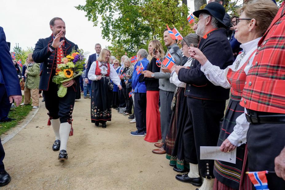 Der ble kronprins Haakon tatt imot av lokale med norske flagg, flere av dem kledd i bunad.