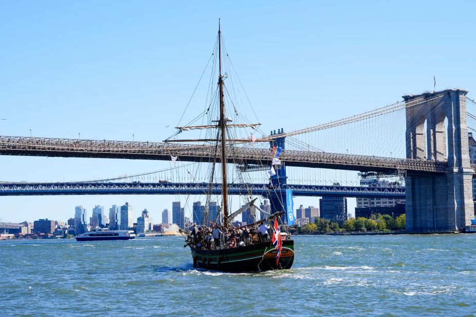 Økonomi og næringsliv: I strålende solskinn seilte replikaskuta Restauration inn havnen til New York City, noe som markerte slutten på en mange måneder lang seilas over Atlanterhavet.