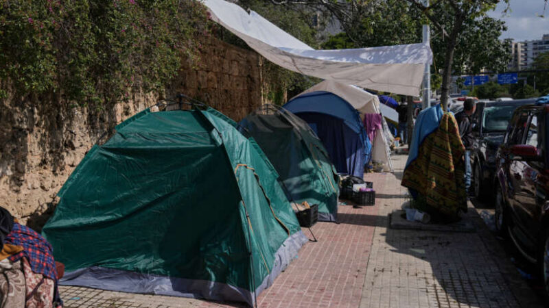 Mange libanesere som er på flukt, bor i telt, her i en gate i hovedstaden Beirut mandag. Foto: Bilal Hussein / AP / NTB