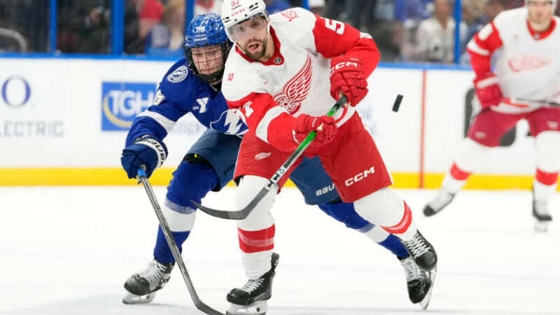 Emil Lilleberg fikk 18 minutter og 49 sekunders spilletid i NHL-kampen på hjemmebane i Tampa. Han var på isen under to av målene til Detroit Red Wings.