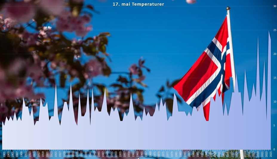 Nasjonaldagen 2025 blir den tredje varmeste 17. mai i historien i regionen. Alle toppnoteringene er registrert de siste 6 årene.
