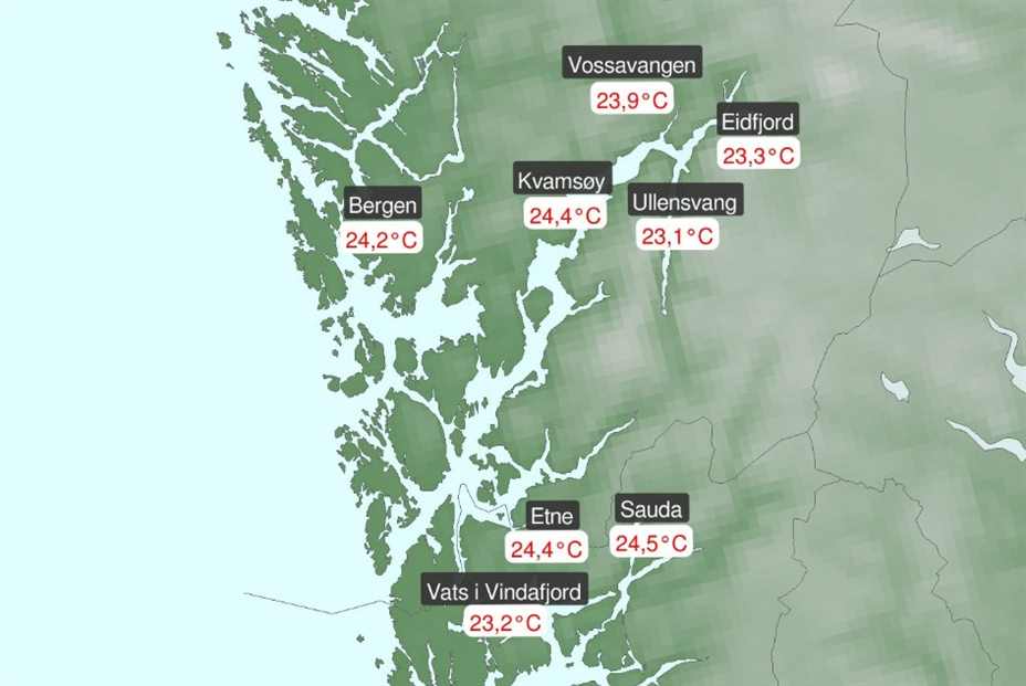 Sommeren kom for fullt i går! Vestlandet tronet øverst på temperaturlista i Norge, og varmest av alle var Sauda med hele 24,5 grader.