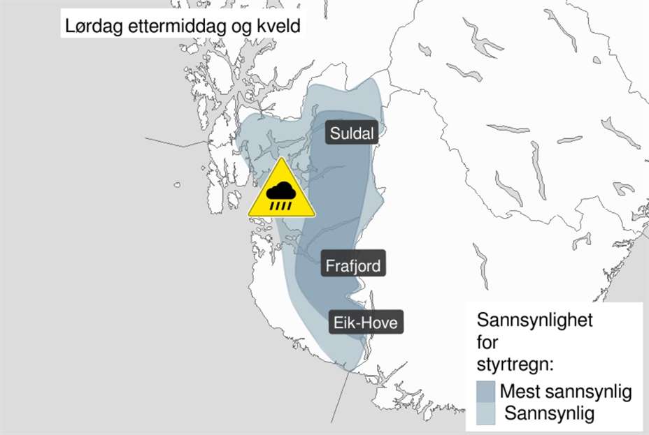 Det er sendt ut varsel om styrtregn på gult nivå for deler av Rogaland lørdag ettermiddag og kveld.