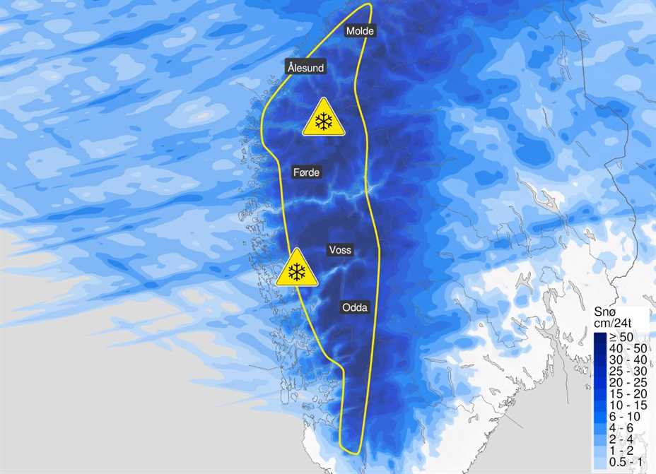 Det er sendt ut gult farevarsel med snø for store deler av Vestlandet torsdag.