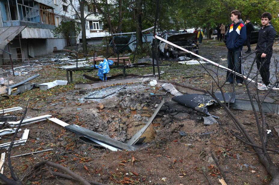Innbyggere i Zaporizjzja står foran et krater fra et russisk angrep natt til søndag. Foto: Kateryna Klotsjko / AP / NTB
