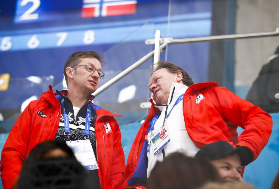 Pål Trulsen hyller det norske landslaget som deltar i EM i Finland. Her fra OL i 2018 med Olympiatoppens Helge Bartnes. Foto: Terje Pedersen / NTB