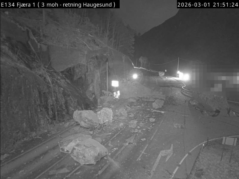 E134 ved Fjæra i Etne forblir stengt etter steinraset søndag. Oppryddingsarbeidet blir omfattende, og veien kan bli stengt i flere dager. Ny vurdering ventes onsdag.