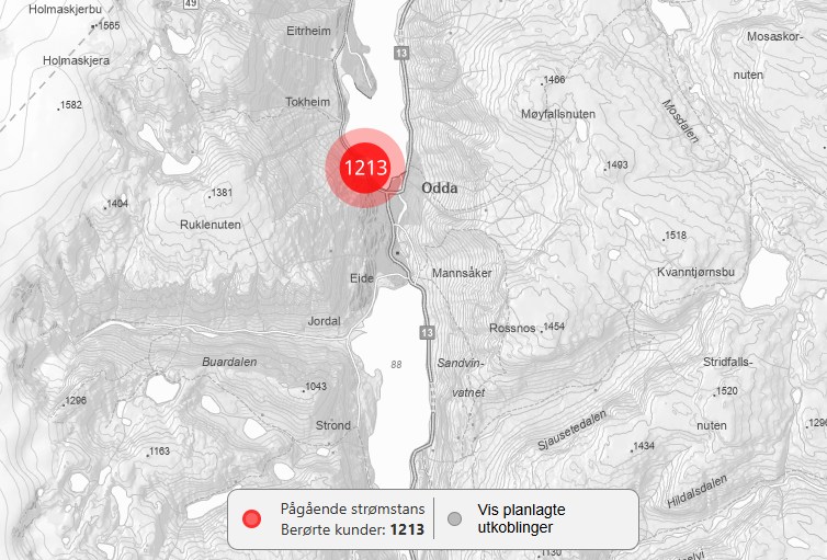 Store deler av Odda mistet strømmen like før klokken 21.40 søndag kveld. Ifølge feilkartet var 1213 kunder berørt av strømbruddet.