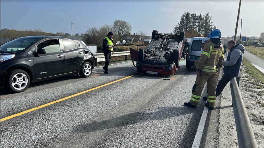 En rekke kjøretøy ble involvert i en trafikkulykke på Avaldsnes i ettermiddag. En bil havnet på taket, men det er ikke meldt om alvorlig personskade.