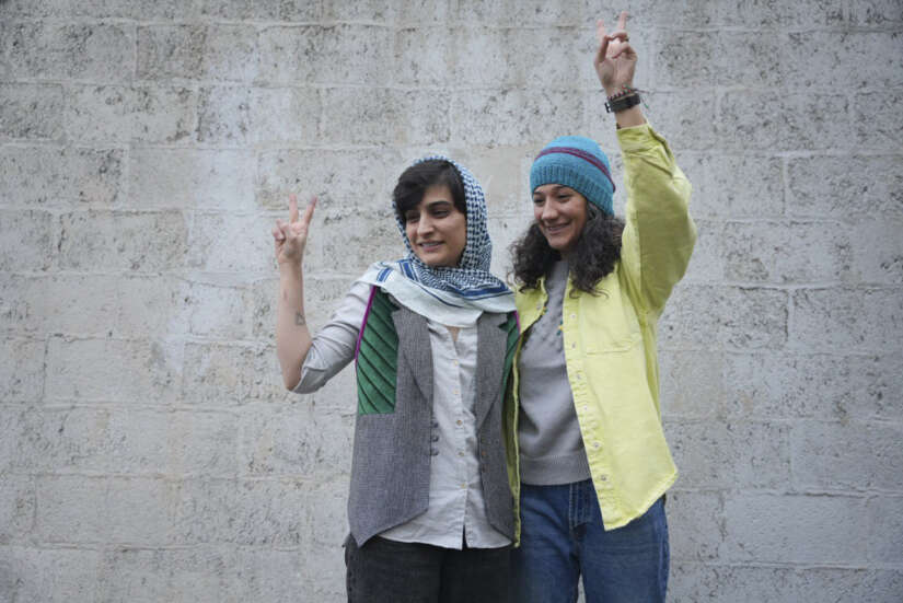 Elaheh Mohammadi (t.v.) her avbildet sammen med Niloufar Hamedi etter at de begge ble løslatt fra fengsel i 2024. Foto: Sahand Taki, Shargh Daily News / AP / NTB
