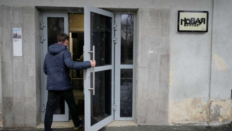 En mann går inn i bygningen som huser redaksjonslokalene til den regimekritiske avisen Novaja Gazeta i Moskva torsdag. Foto: Pavel Bednjakov / AP / NTB