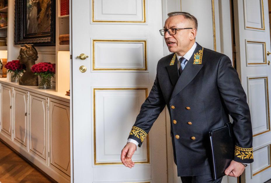 Russlands ambassadør til Norge, Nikolaj Kortsjunov, skryter av Donalds Trumps innsats for fred, og mener årets fredspristildeling er å blande seg inn i Venezuelas indre anliggende. Her er han på vei til audiens hos Kongen i november i fjor. Foto: Ole Berg-Rusten / NTB