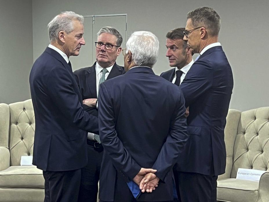 Statsminister Jonas Gahr Støre (Ap) sammen med Storbritannias statsminister Keir Starmer og Frankrikes president Emmanuel Macron. Finlands president Alexander Stubb er også avbildet. Foto: Anne Kristin Hjukse / Statsministerens kontor / NTB