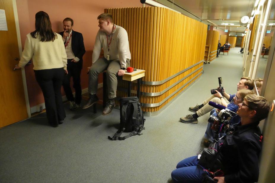 Pressen venter på gangen i Stortinget i forbindelse med budsjettforhandlingene. Foto: Heiko Junge / NTB
