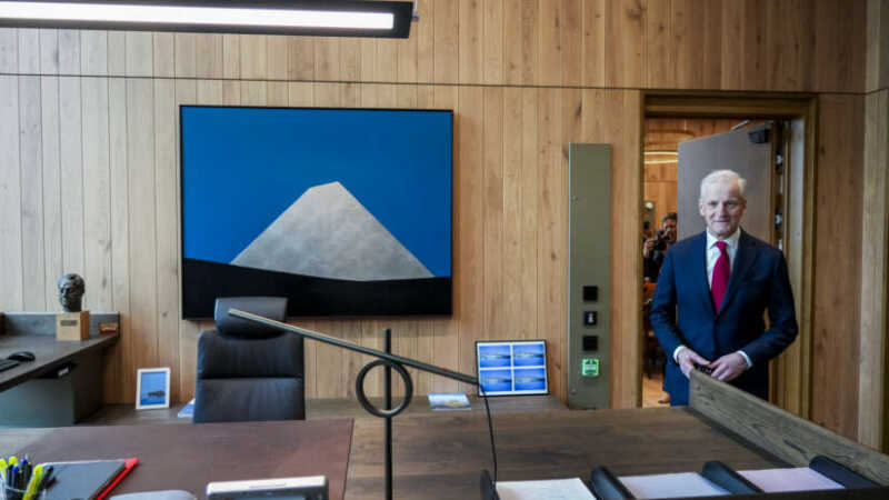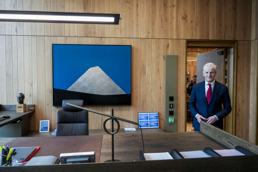 Statsminister Jonas Gahr Støre (Ap) viser fram sitt nye kontor i regjeringskvartalet. Bildet på veggen heter «Nunatak Argent» av Anna-Eva Bergman. Maleriet ble innkjøpt av Koro (den gang Utsmykningsfondet) til Høyblokka og Statsministerens kontor i 1986. Verket hang der fram til kort tid etter 22. juli 2011 og ble hentet ut uten synlige skader. Nå er det på plass igjen. Foto: Ole Berg-Rusten / NTB