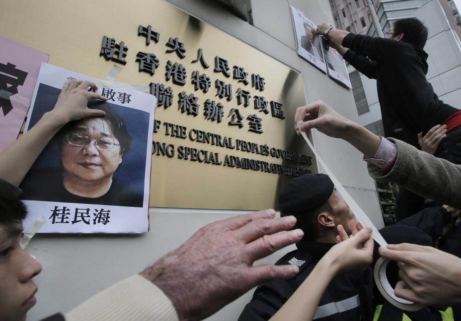 Gui Minhai, avbildet på plakaten, var savnet i tre måneder, før han dukket opp på kinesisk fjernsyn. Foto: Vincent Yu / AP / NTB