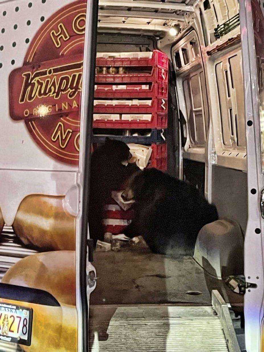 To bjørner har raidet en varebil som skulle levere doughnuts på en amerikansk militærbase i delstaten Alaska. Kuriosa og kjendiser: Sjåføren lot dørene stå åpne da...